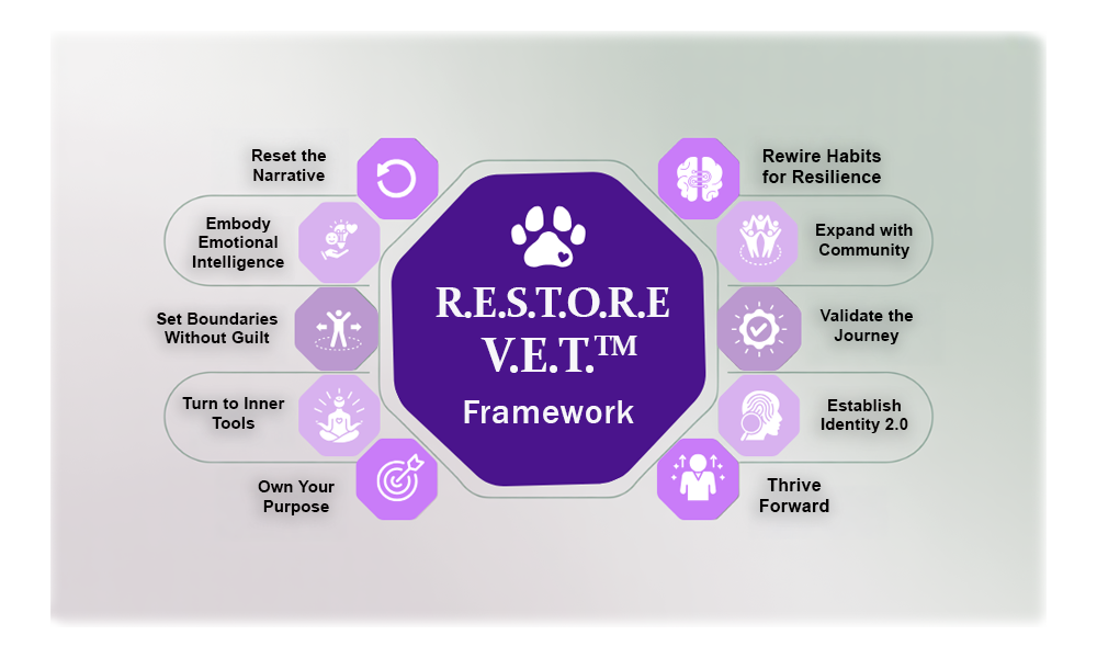Discover how our 10-step R.E.S.T.O.R.E. V.E.T.™ Framework transforms emotional exhaustion into clarity, calm, and confidence.